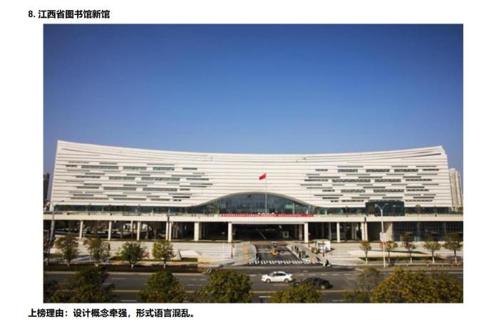 其中,在評選時爭議較大的是江西省圖書館新館。榜單公佈後,王明賢還收到了建築師同行的短信討論,覺得它算不上特別醜陋。