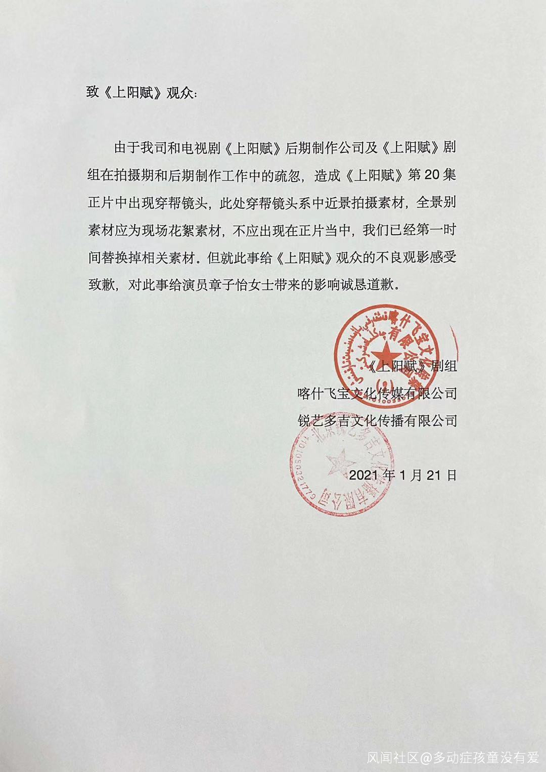1月21日,《上陽賦》通過官方微博發佈致歉信。