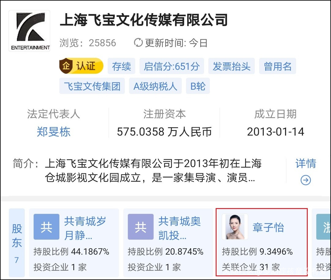 工商信息顯示,喀什飛寶文化傳媒有限公司是上海飛寶文化傳媒公司100%持股的子公司,章子怡持有後者9.3496%的股份,是最大個人股東。飛寶傳媒在企業簡介和新聞通稿中曾經寫説:著名國際影星章子怡於2017年加盟公司,飛寶傳媒也成為章子怡唯一合作的影視公司。