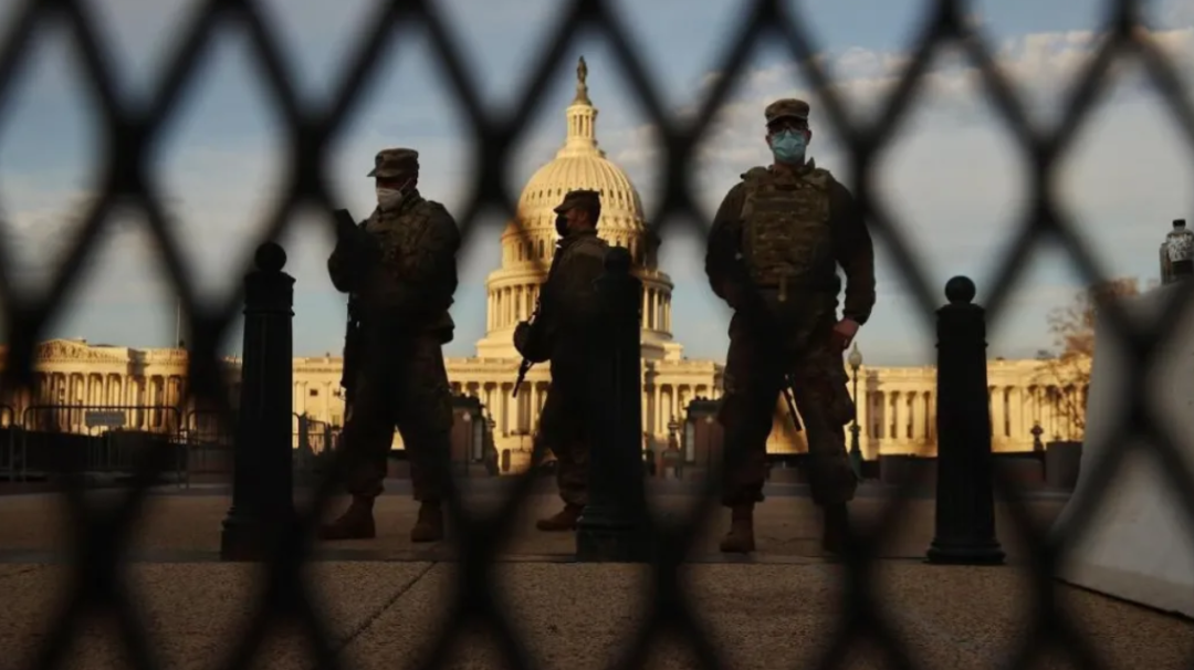 華盛頓特區部署了2萬5000名士兵,人數超過了美國目前在阿富汗、伊拉克和敍利亞駐軍的3倍還多。這麼多槍,指着誰?防備誰?敵人是誰?説好的“自由世界”呢?