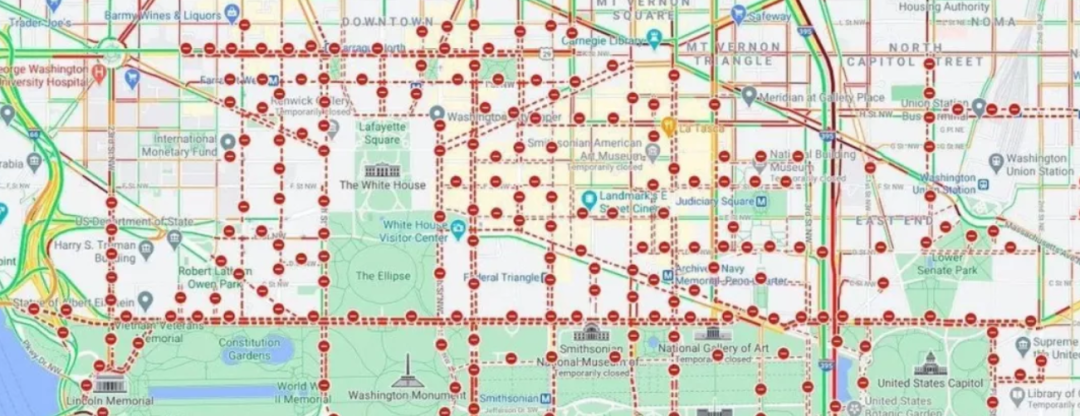 這是一個奇怪的總統就職典禮,華盛頓全境封鎖,被兩萬五千條槍圍得像鐵桶一樣,國會大廈周邊每一條街道都被鐵柵欄圍起來,華盛頓紀念碑關閉,暫停旅遊。並且嚴格限制交通,主要橋樑關閉,地鐵和公交也部分暫停了。如果有這個魄力去防控新冠病毒,美國也不會死那麼多人了。