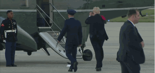 當時,特朗普正在準備登上專屬座駕“海軍陸戰隊一號”(Marine One),因為現場風大,一位站崗士兵的帽子被吹落,當特朗普路過時,彎腰撿起帽子併為這位士兵戴上,還拍了拍他的肩。