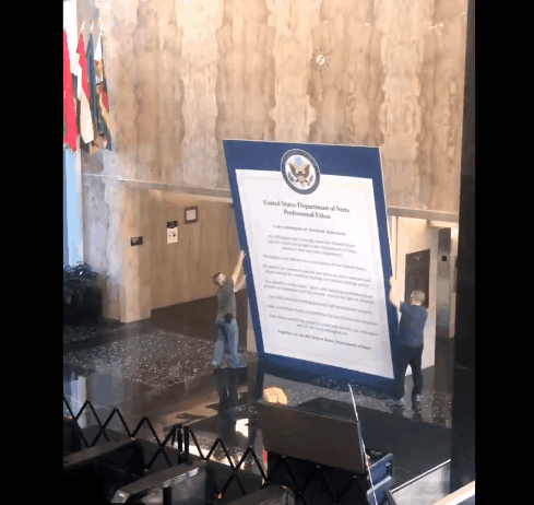 2019年4月26日,正值蓬佩奧擔任美國國務卿一週年之際,他公佈了美國國務院的“新職業精神”,並且在國務院大廳裏立起了一塊“職業精神”大標牌。