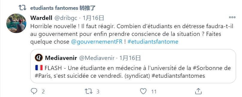 受到的困擾的學生們在推特建立了一個賬户etudiantsfantomes(像鬼一樣的學生),希望大家一起解決當下的困難。
