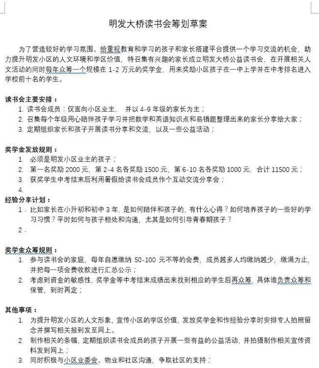 擬定每年眾籌1-2萬獎學金,獎勵在一中高考排名前十的學生,其中第一名獎勵2000元,第2-4名各獎勵1500元,第6-10名各獎勵1000元,合計11500元。