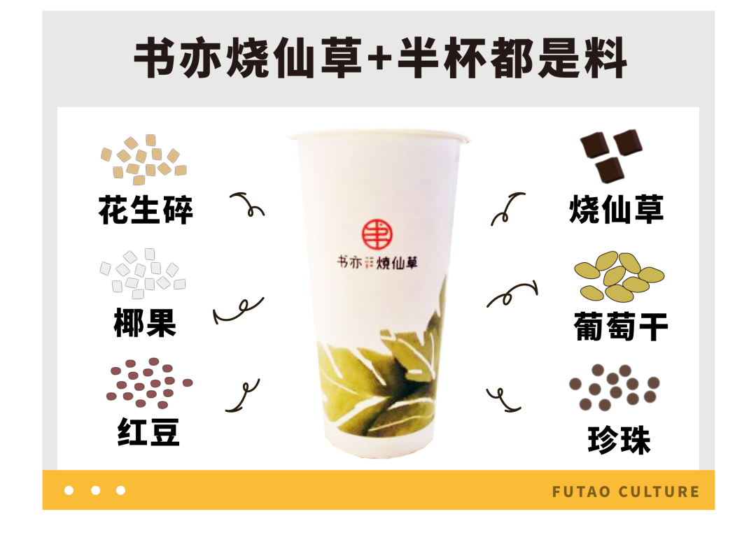 湖南人王斌帶着一腔的創業熱血,跑到成都開了一家飲品店,書亦85度tea。因為被面包品牌85℃起訴侵權,17年初更名為“書亦燒仙草”——大家記住這個品牌,是因為它的口號是**“半杯都是料”**。