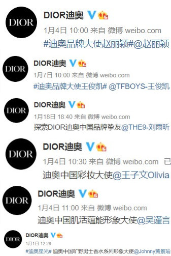 根據網友統計,Dior迪奧就曾在同一時間內擁有16位品牌大使。從男演員到女愛豆,迪奧似乎想要觸及整個消費羣體。但作為全球六大藍血品牌之一的迪奧,批發“大使”這種行為無疑是在自降身價。