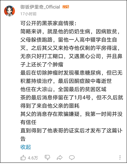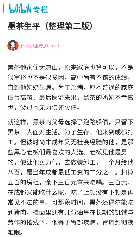根據該UP主22日在@墨茶official 評論區的留言與整理的《墨茶生平》一文,@墨茶Official 短暫的人生軌跡漸漸顯露於人前: