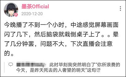 這條動態發佈的幾天後,他表示自己在直播中途突然昏迷了幾分鐘,“感覺屏幕畫面閃了幾下,然後腦袋就栽倒桌子上了”。他還説,“問題不大,下次直播會注意的”。