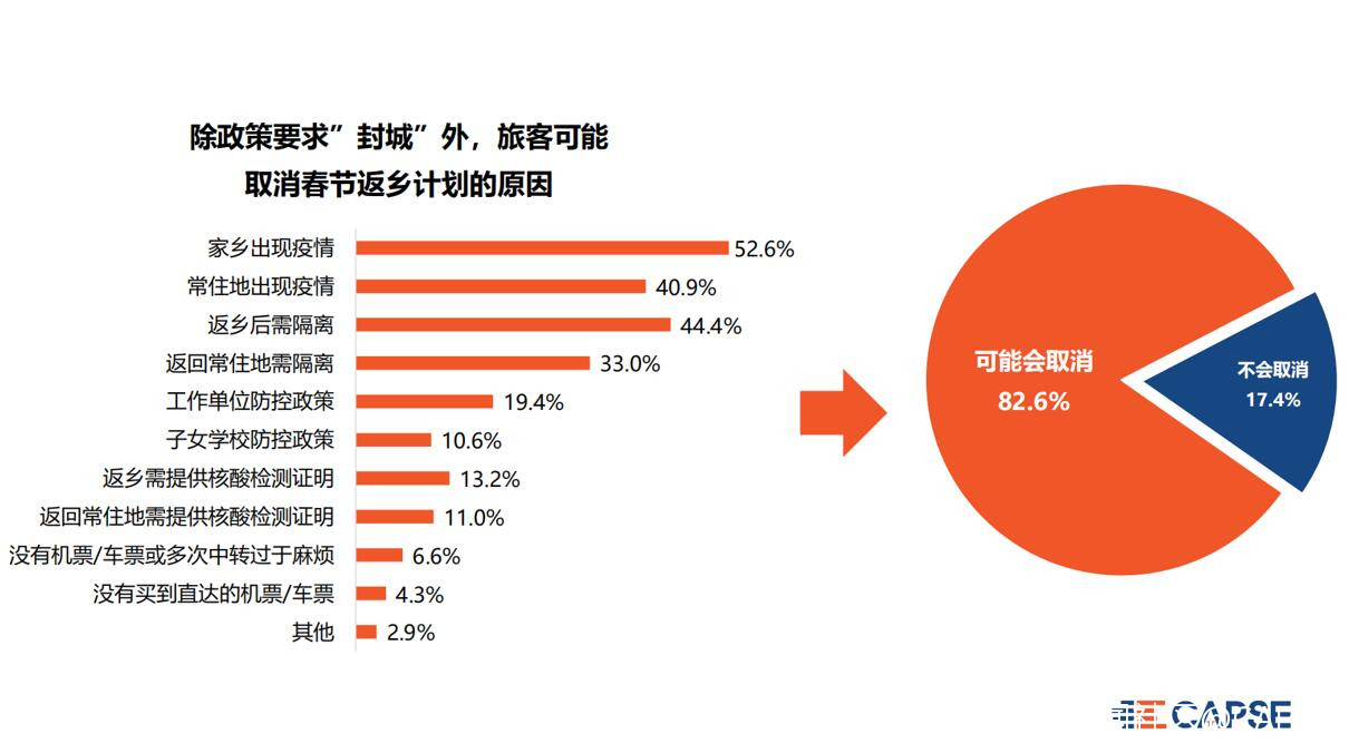 除政策要求“封城”等強制性規定外,受疫情影響,仍有超8成計劃返鄉旅客可能取消行程,其中家鄉/常住地出現疫情對計劃返鄉旅客取消行程影響最大、其次為返鄉/返回常住地需隔離。
