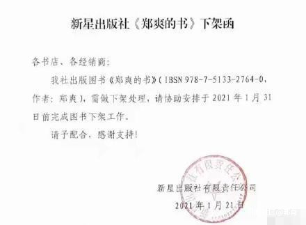 代孕風波後,鄭爽的書也被出版社要求下架。昨天,一份新星出版社發給全國各大書店以及經銷商的下架函在社交媒體流傳,該函件稱,該社出版圖書《鄭爽的書》,需做下架處理,並且要求在本月內就要完成圖書的下架工作。