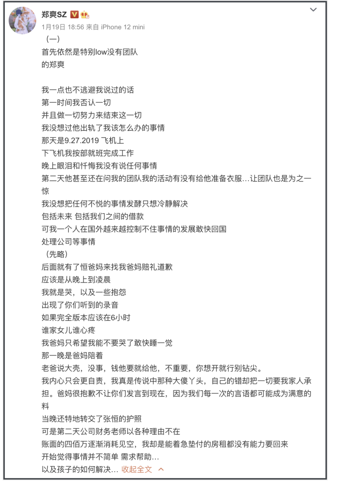 但讀到結尾時,她卻突然留下一句:“以及孩子的如何解決…”在抽完第五根煙後,我還是沒整明白鄭爽的《聲明》到底啥意思。