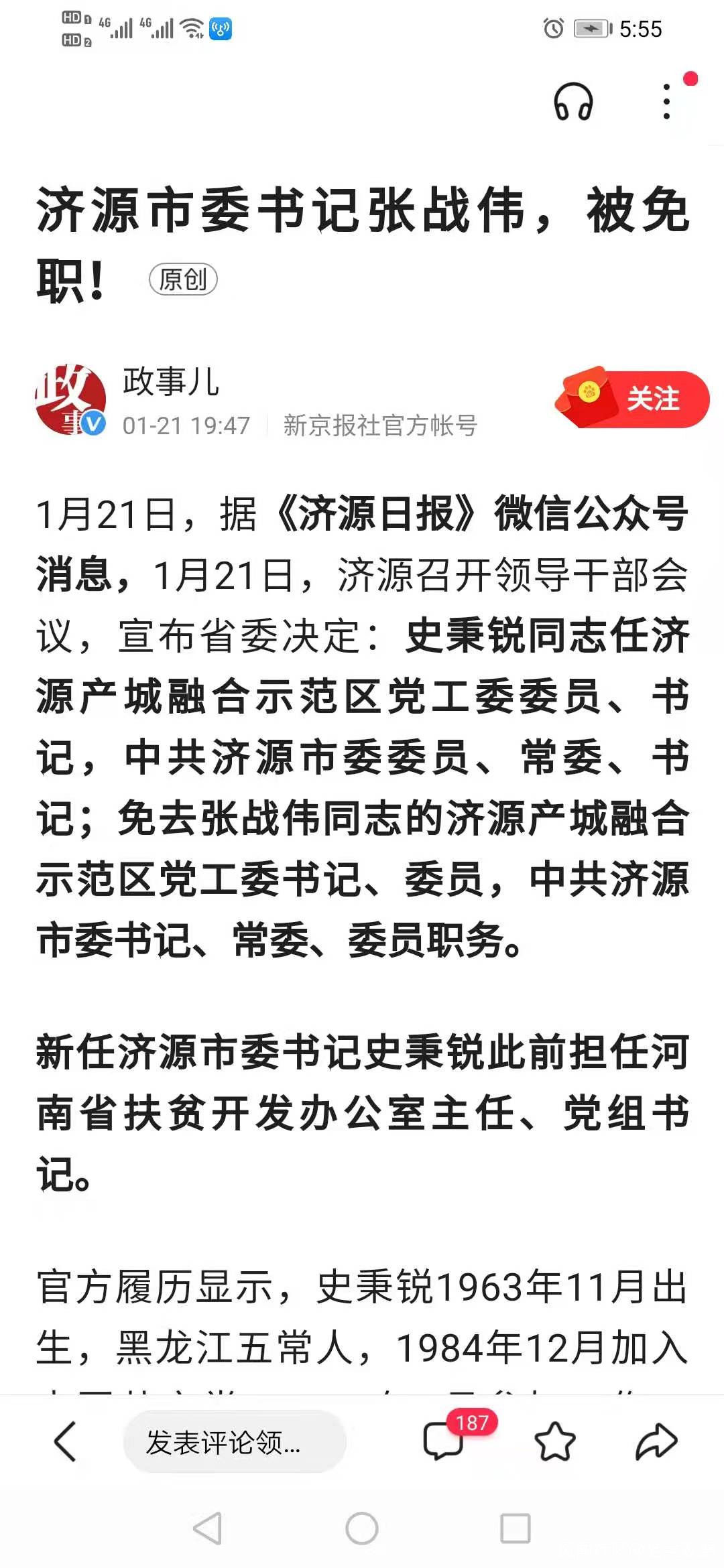 1月21日,據《濟源日報》微信公眾號消息,1月21日,濟源召開領導幹部會議,宣佈省委決定:史秉鋭同志任濟源產城融合示範區黨工委委員、書記,中共濟源市委委員、常委、書記;免去張戰偉同志的濟源產城融合示範區黨工委書記、委員,中共濟源市委書記、常委、委員職務。