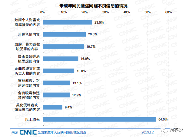 根據《2019年全國未成年人互聯網使用情況研究報告》,全國46.0%的未成年網民曾在上網過程中遭遇過各類不良信息。其中,淫穢色情內容佔比20.6%,排名第二。