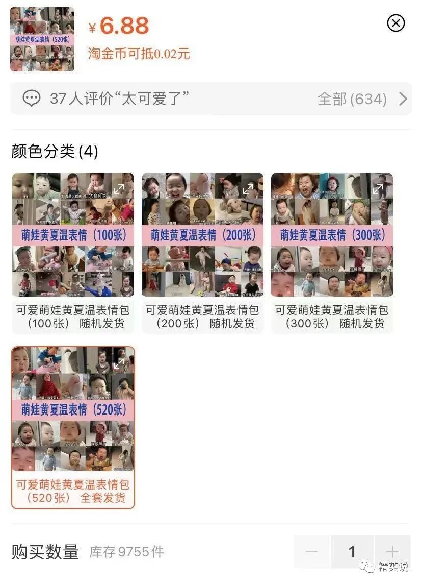 如果你在電商平台上搜索就會發現,這些“萌娃”表情包被明碼標價、打包出售,100張賣1.49元,520張,標價為6.88元。該店鋪同時有多套表情包在售,月銷件數最高100+。