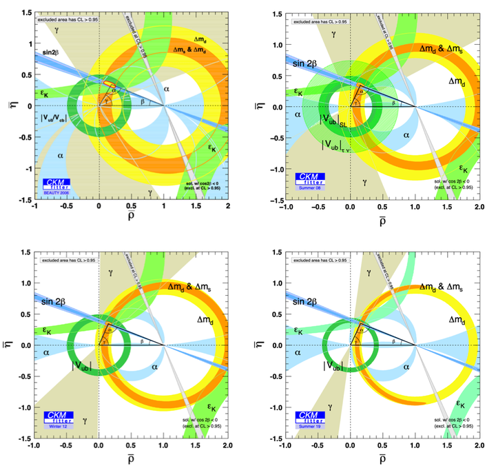 科學家最近十五年對於幺正三角形測量的發展歷史。四張圖分別是科學家在2006年(左上)、2008年(右上)、2012年(左下)與2019年(右下)對於幺正三角形的認知,每一種不同顏色的色塊表示一直不同的測量途徑。如果標準模型完美成立,所有的測量途徑的色塊都應該在三角形最上面的頂點上重合。