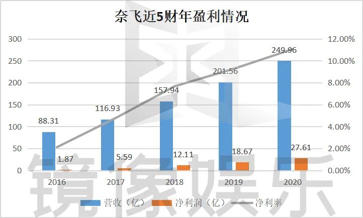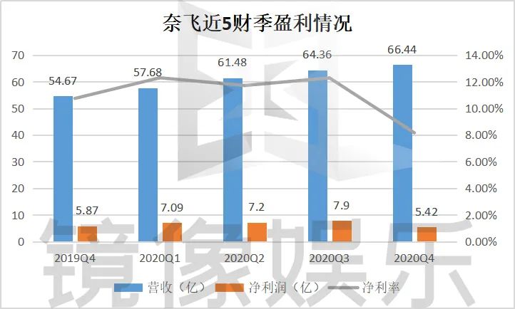 2020年全年,奈飛營收為249.96億美元,與上年的201.56億美元相比增長24%,淨利潤同比增長47.9%至27.61億美元,攤薄後每股盈利6.08美元,上年同期為4.13美元。奈飛每財季的營收和淨利潤都保持穩定增長,2016-2020財年的淨利率分別為2.11%、4.78%、7.67%、9.26%、11.05%,意味着奈飛的經營效率在持續增強。