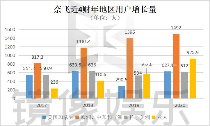 2020全年,美國和加拿大地區流媒體服務的付費用户淨增627.4萬人,歐洲、中東和非洲地區付費用户淨增1492萬人,拉丁美洲地區付費用户淨增612萬人,亞太地區付費用户淨增925.9萬人。