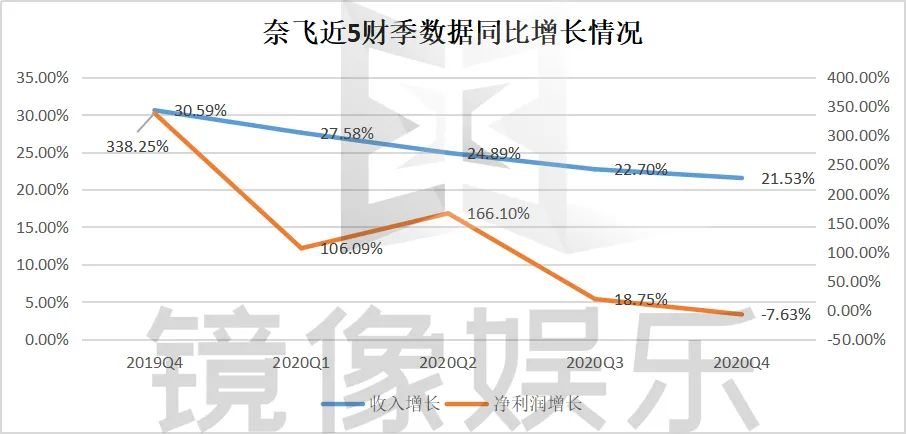 根據近5個財季的數據來看,奈飛的營收數據穩定,每季度都保持着20%左右的同比增幅。