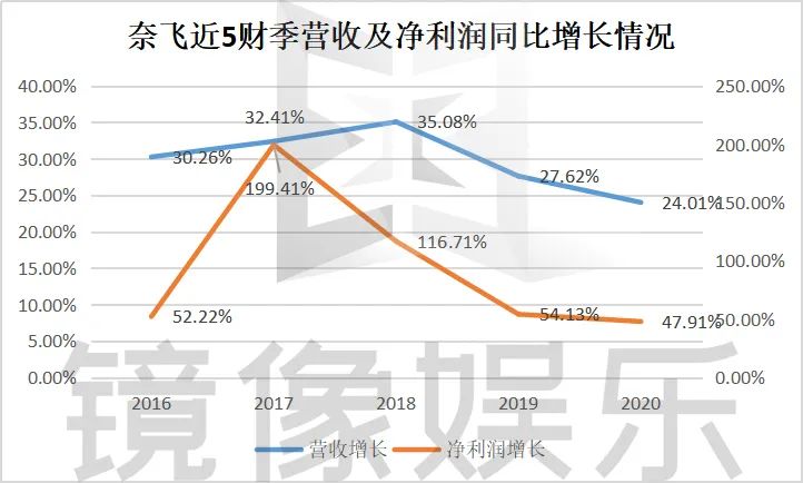 不過,奈飛近3年來的營收和淨利潤的同比增長幅度卻持續下降。2018年,奈飛的營收同比增長為35.08%,淨利潤同比增長116.71%,2019年這兩項數字變為27.62%和54.13%,2020年則為24.01%和47.91%。