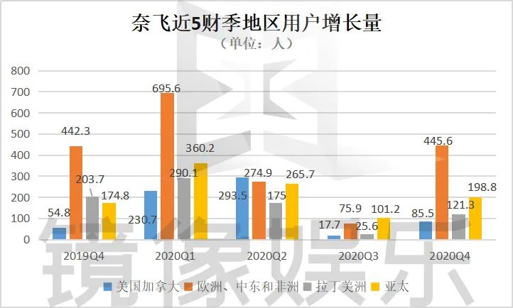 2020年Q4,奈飛全球流媒體視頻服務的付費用户淨增851萬人,低於去年同期的876萬淨增。2020全年,流媒體付費用户總數為2.037億,同比增長21.9%。