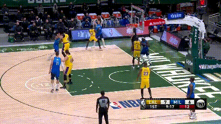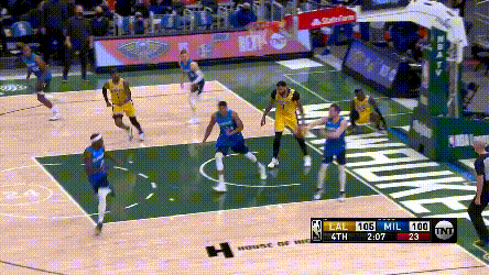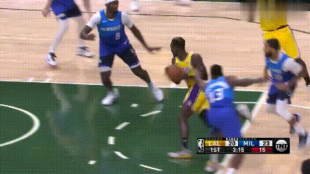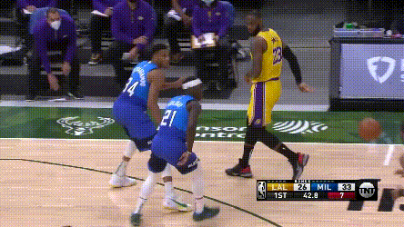 但是,當詹姆斯和濃眉分別對位二人時,這組擋拆除了偶爾偷雞,意義就不大了——對面可以直接換防。湖人防霍樂迪與字母的擋拆會難一些,但濃眉兼顧能力夠強,字母掩護後還是要順下,又成了挑戰濃眉的遊戲。
