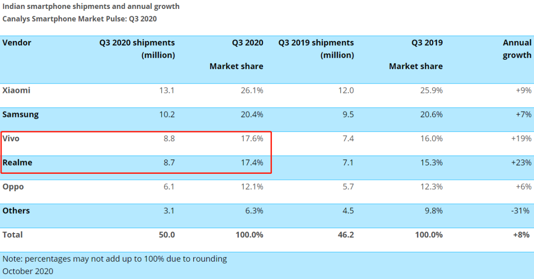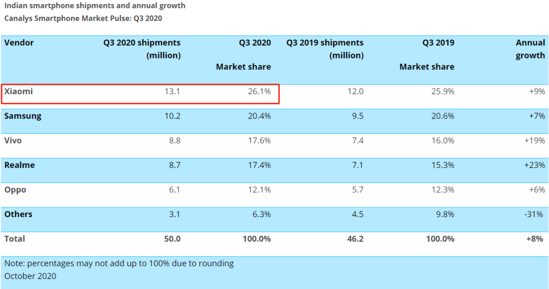 儘管印度有着反華情緒,但 2020 年第三季度的印度手機出貨量已經説明了一切,光是小米一個品牌就達到了1310 萬台。。。