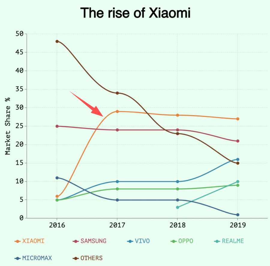 事實證明小米的做法是正確的,小米在印度的市場份額一路狂飈,直接幹翻了三星。