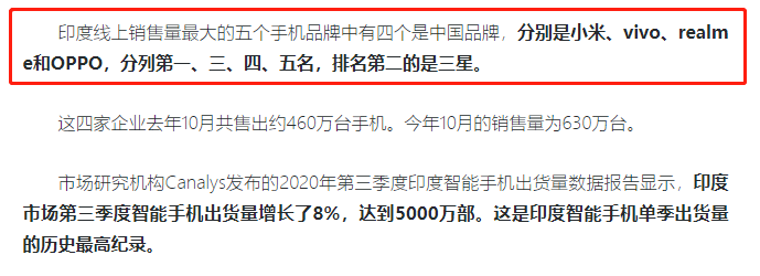 其中一項數據卻引起了差評君的興趣,説國產手機品牌 2020 年第三季度在印度的銷量再創新高。****