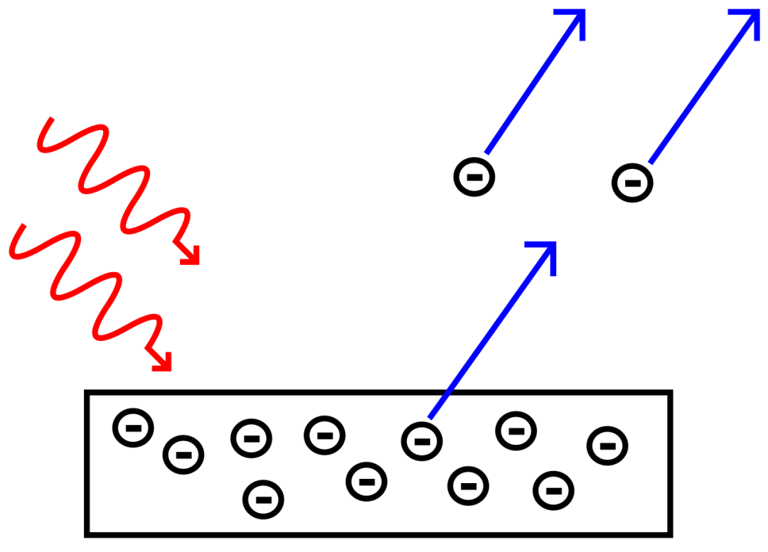當光子撞擊到光電陰極 (通常是鹼金屬薄膜或者砷化鎵一類的半導體物質)後,材料會吸收光子的能量,如果這個能量大於這種材料的逸出功,光電子就會被激發出來,這就是光電效應現象。