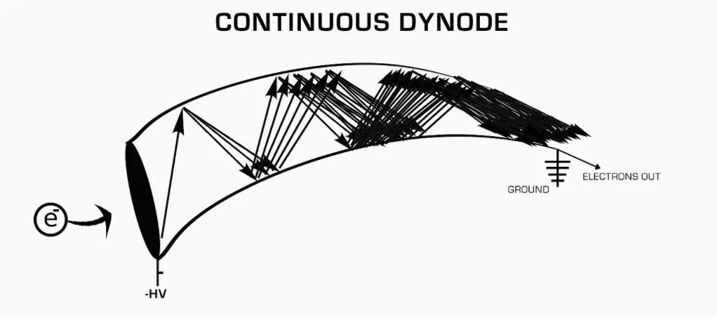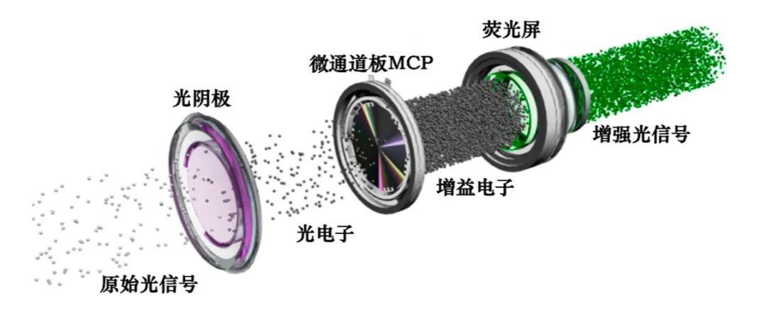 光電陰極將微弱的原始光信號通過光電效應轉化成光電子,再通過微通道板對電子進行倍增,利用二次發射的電子能將光電子數量增加數百上千倍,最後在熒光屏幕 (陽極)上將增強後的電子信號再次轉換為光學信號,讓人眼可以看到。在整個過程中,電子會被外加的靜電場加速,進一步增強信號。