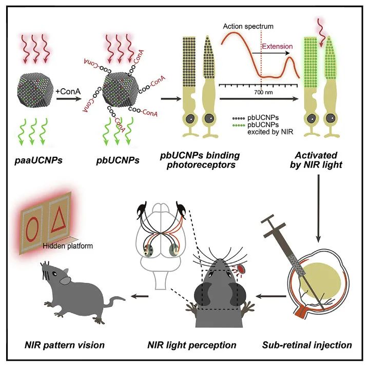 事實上科學家們已經研發出了一種非常微小的設備“上轉換納米粒子”,在小鼠身上的測試表明,納米粒子會自動附着在小鼠視網膜的光感受器上,吸收紅外光並將其轉換成可見的綠光。被“增強視覺”的小鼠不僅能感知紅外光,還能區分研究人員所提供的不同紅外模式。