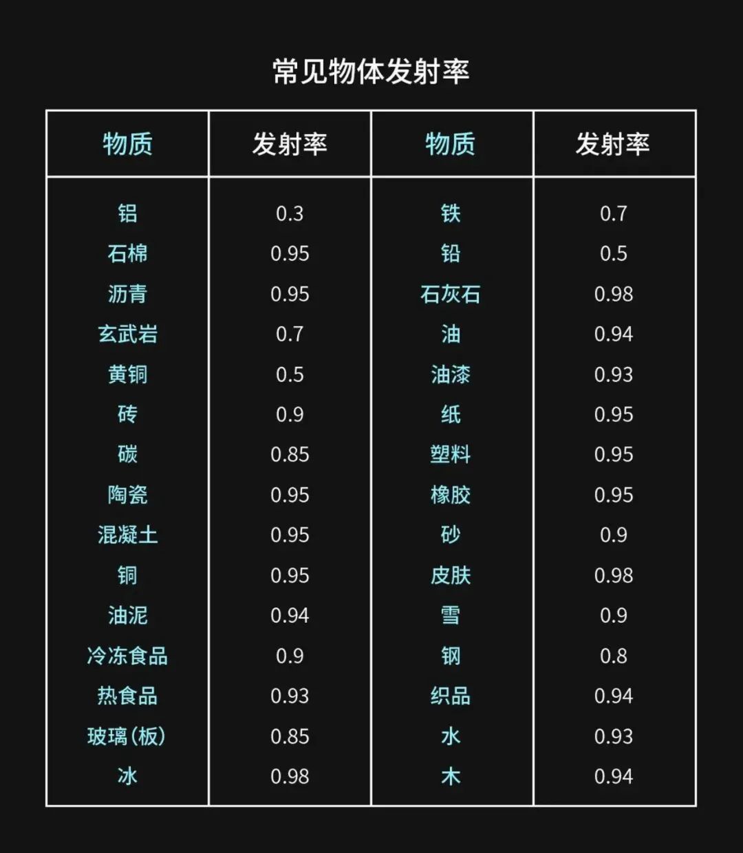 相同温度、不同發射率的物體在紅外熱成像儀上亮度是不同的。因此,我們還需要人為地將我們待測物體的發射率告訴儀器,才可能得到較為準確的温度值。另外,温度的測量值還會被測量距離,環境因素所影響,在這裏就不做過多贅述了。