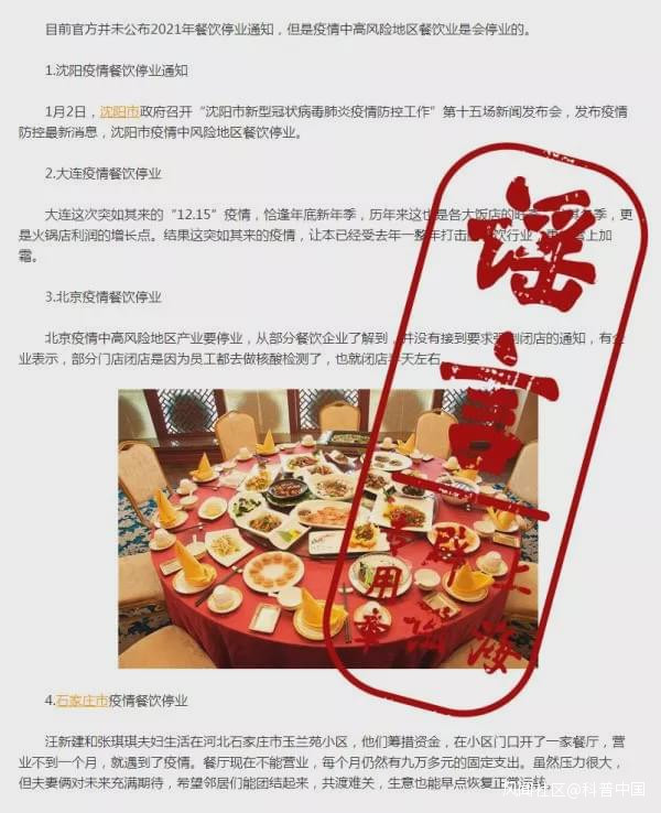 中國政府網搜索結果截圖另外,各官方平台以及權威媒體都沒有發佈過“2021年春節延長至2月27日”消息。可見,網傳消息純屬謠言!網上一些很抓人眼球的消息其實是謠言,但同時也有一些消息真假難辨。下面,我們整理了近期關於新冠肺炎的最新一批謠言。多地餐飲已停業?謠言:近日,網上熱傳一則“2021年餐飲停業通知”,稱“疫情中高風險地區餐飲業會停業”。網傳消息稱,瀋陽、大連、北京、石家莊等地的餐廳已經停業了。