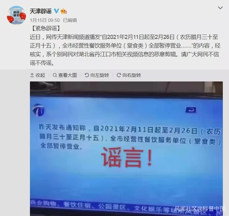 所有企業單位提前停工放假?謠言:近日,有消息稱:“所有企業單位2021年1月20日必須做到全部停工放假;所有國家重點基礎設施2021年1月10日停工。”闢謠:春運將於1月28日啓動,3月8日結束。各地放假、辦公政策安排差異較大,但均無相關停工消息。護士感染病毒,全市核酸檢測取消?謠言:近日,一則消息在微信羣中迅速傳播,大致內容是黑龍江安達市的核酸檢測取消了,因為有個做核酸的護士被查出感染了新冠病毒。