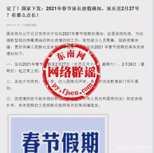 近日,微信羣熱傳《定了!國家下發:2021年春節延長放假通知,延長至2月27號 ?有那麼點長!》文章,文章稱:2021年春節假期將延長至2月27日。真有這事?