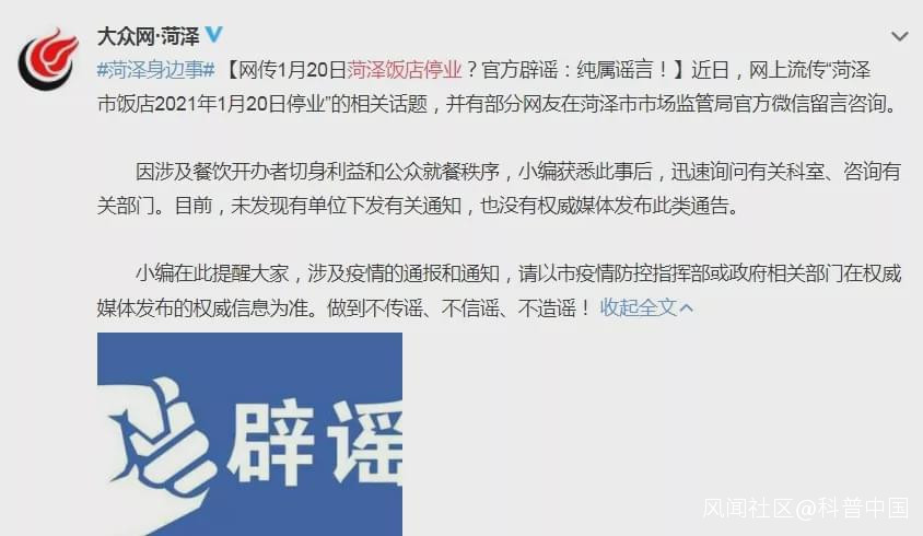 所有企業單位提前停工放假?謠言:近日,有消息稱:“所有企業單位2021年1月20日必須做到全部停工放假;所有國家重點基礎設施2021年1月10日停工。”闢謠:春運將於1月28日啓動,3月8日結束。各地放假、辦公政策安排差異較大,但均無相關停工消息。護士感染病毒,全市核酸檢測取消?謠言:近日,一則消息在微信羣中迅速傳播,大致內容是黑龍江安達市的核酸檢測取消了,因為有個做核酸的護士被查出感染了新冠病毒。