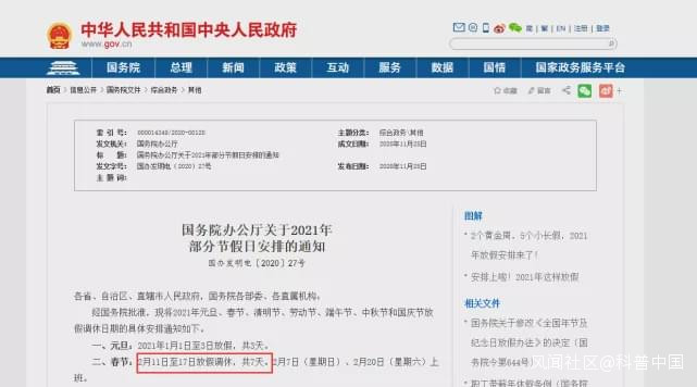 經查詢,國務院辦公廳於2020年11月25日發佈《國務院辦公廳關於2021年部分節假日安排的通知》指出:春節:2月11日至17日放假調休,共7天。