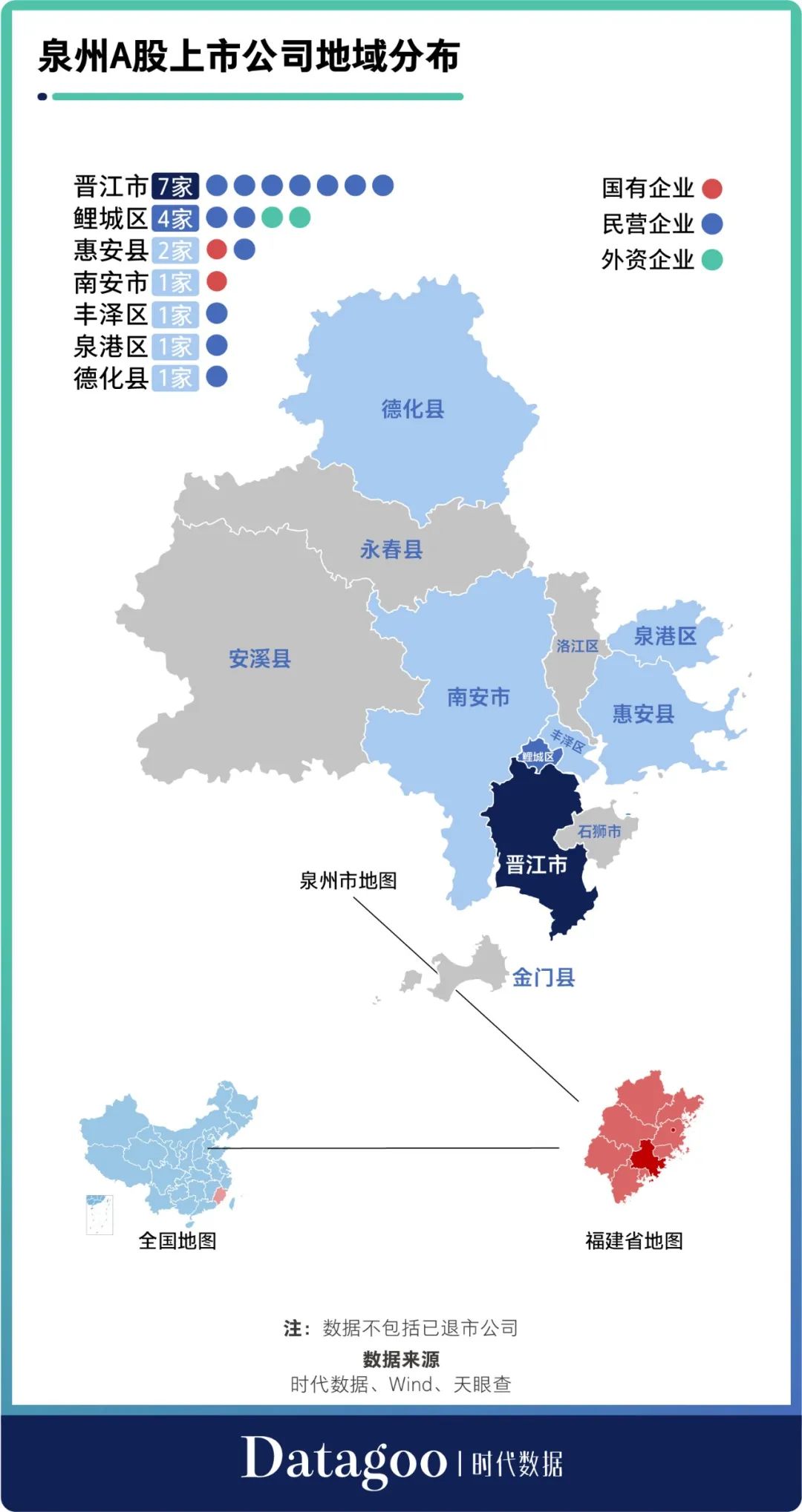 從上市公司地域分佈來看,**位於閩南金三角核心區的晉江市集聚的上市公司最多,達到7家,均為民營企業。**其後,擁有泉州經濟技術開發區的鯉城區擁有4家上市公司,其中民營企業、外資企業各有2家。此外,惠安縣、南安市、豐澤區、泉港區、德化縣分別擁有上市公司2家、1家、1家、1家、1家。