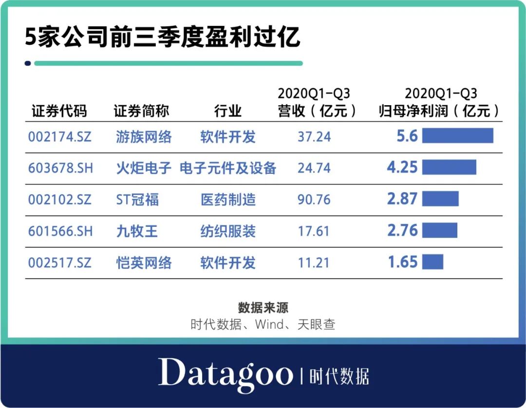 具體來看,擁有覆蓋全球80億移動設備的移動開發者服務平台遊族網絡(002174)業績雄踞第一,前三季度營收37.24億元、淨利潤5.6億元。其後,專業從事陶瓷電容器研發和生產的火炬電子(603678)前三季度營收24.74億元、淨利潤4.25億元。此外,ST冠福(002102)前三季度淨利潤2.87億元,排在第三。