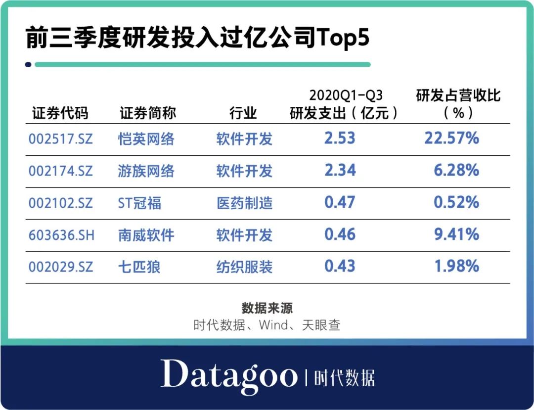 **據時代數據統計,這17家上市公司2020年前三季度在研發方面的平均投入為0.51億元。**其中,研發投入過億的上市公司只有2家,均為軟件開發企業。