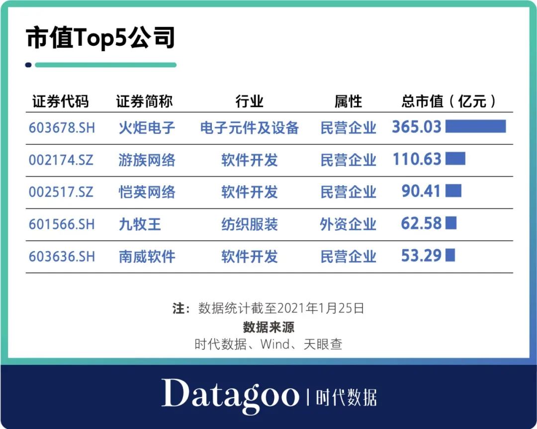 從公司來看,火炬電子(603678)的市值最高,達到365.03億元;其次是遊族網絡(002174),市值達到110.63億元;緊隨其後的是愷英網絡(002517),市值為90.41億元。