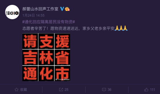 作為通化最知名的明星,郝蕾在她僅有一萬粉絲的工作室賬號上,發了一條微博。“志願者辛苦了!願物資速速送達,家鄉父老鄉親平安。”連標點符號在內,24個字。25人轉發,36條評論。