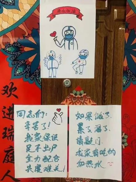 每一位通化人可能都有親朋好友參與防疫工作,他們的辛苦都被看在眼裏疼在心裏。1月21日封户之夜,很多通化人都在門上貼了暖心的紙條,主動配合封户。抖音上有一個視頻,兩個孩子隔着門對着防疫人員唱歌,讓人感動。