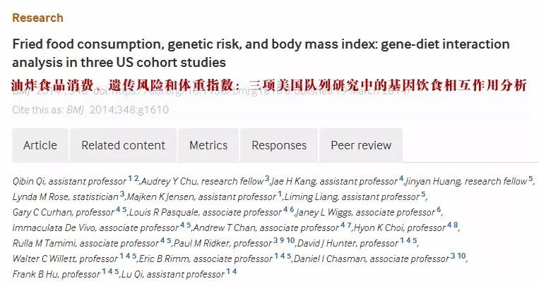 2014年一項來自哈佛公共衞生學院的研究,納入了來自兩個隊列研究的9623名女性和6379名男性參與者,並在21421名女性中進行重複驗證,發現:油炸食品攝入與肥胖相關的遺傳易感性間存在交互作用。②