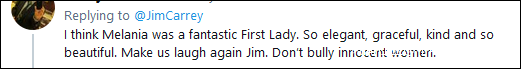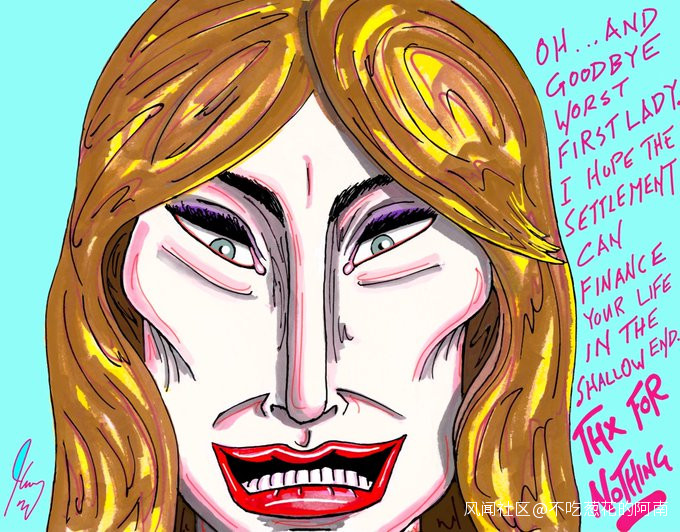 1月3日,金·凱瑞在推特上發佈了一張梅拉尼婭張着“血盆大口”的漫畫,並在畫面一側附文:“哦……再見了最糟糕的第一夫人。我希望那封和解協議能讓你拿到贍養費——一分都沒有!”