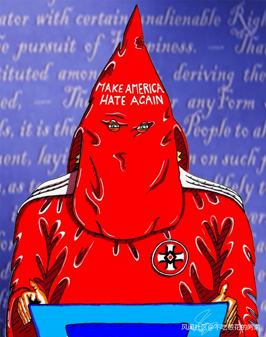 他諷刺特朗普的“讓美國再次偉大”,畫了一個坐在電腦前的人戴着一頂印有“讓美國再次充滿仇恨”的面罩:
