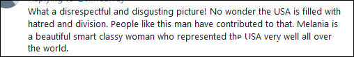 不過他這種“極端”的畫風也引來了不少批評。例如在梅拉尼婭的這張諷刺漫下,有人認為“梅拉尼婭是個很棒的第一夫人,優雅又漂亮……不要霸凌無辜的女人。”