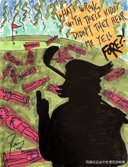 他諷刺特朗普在槍擊案發生時忙着“打高爾球”和“發推特”: