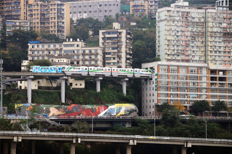 既是“山城”也是“江城”的重慶,在城市交通建設上幾乎沒有平面規劃的概念,高架路、隧道、索道和橋樑比比皆是。重慶的軌道交通,很少緊貼地面或者穿行於地下,一會兒跨過江面,一會兒橫過樓頂倒是常態。一度成為網紅景點的2號輕軌李子壩站,甚至直接就建在一棟居民樓的第8層,列車就這樣從羣山間蜿蜒而來,從樓宇間呼嘯而過。